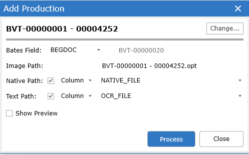 When the production also includes a DAT file, the Image Path, Native Path and Text Path will be updated with the information from the DAT. While the tool detects the Bates Field, Image Path, Native Path and Text Path from the DAT file, these fields are editable if modifications are needed.