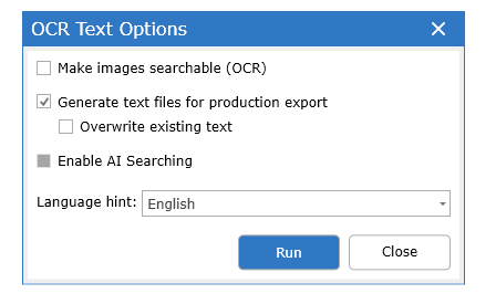 - Overwrite exiting text - for use when existing text should be replaced (all other options will skip documents for which text has already been extracted). For produced documents the text will always be the text that was produced.
